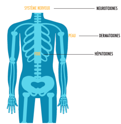 «Les cyanotoxines peuvent être classées en trois groupes, selon l’effet qu’elles ont sur les humains et les animaux. Les hépatotoxines, très abondantes dans les pays tempérés, forment le groupe le mieux connu et étudié. Ce dernier engendre des effets principalement sur le foie et le système digestif. Les neurotoxines, retrouvées principalement dans les pays tropicaux, ont des effets foudroyants, car elles affectent le système nerveux, le cœur ainsi que les voies respiratoires. Enfin, les dermatotoxines sont des toxines qui agissent au contact de la peau. Elles deviennent urticaires lorsqu’elles sont abondantes, et provoquent des dermatites. Ce sont les toxines affectant le plus les humains.»